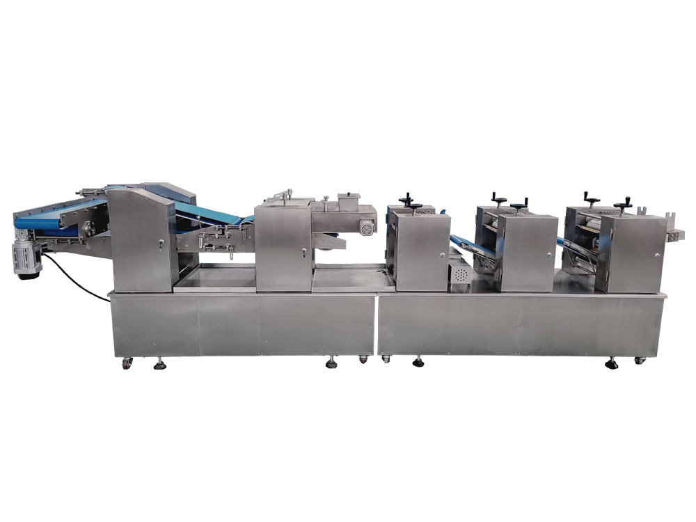 制皮機(jī)為臥式成型機(jī),通過(guò)傳送機(jī)構(gòu)將各道軋輥線(xiàn)速度比合理分配,實(shí)現(xiàn)從投料到制皮成型自動(dòng)化生產(chǎn)。適用于餃子皮、餛飩皮、燒麥皮、蒸餃皮、以及燙面類(lèi)面皮成型。